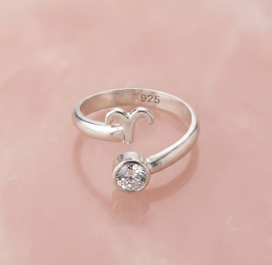 El diseño abierto de este anillo simboliza la fluidez y la conexión con el cosmos. De un lado, el distintivo del zodiaco aporta un toque de identidad única; del otro, una circonia blanca cuidadosamente engarzada actúa como un punto de luz constante que captura los reflejos con cada movimiento. Esta combinación entre el significado astrológico y el lujo del brillo clásico lo posiciona como una joya con alma, diseñada para quienes buscan accesorios que cuenten su propia historia.