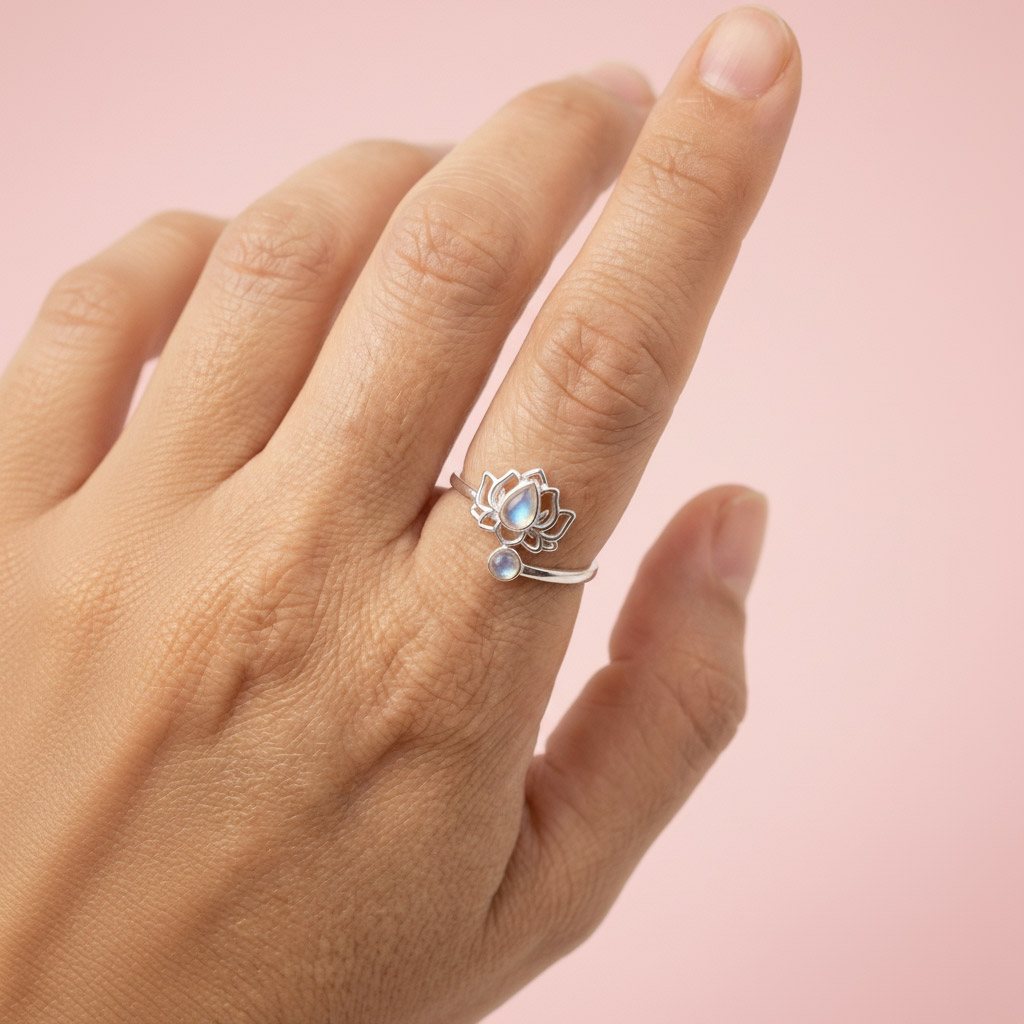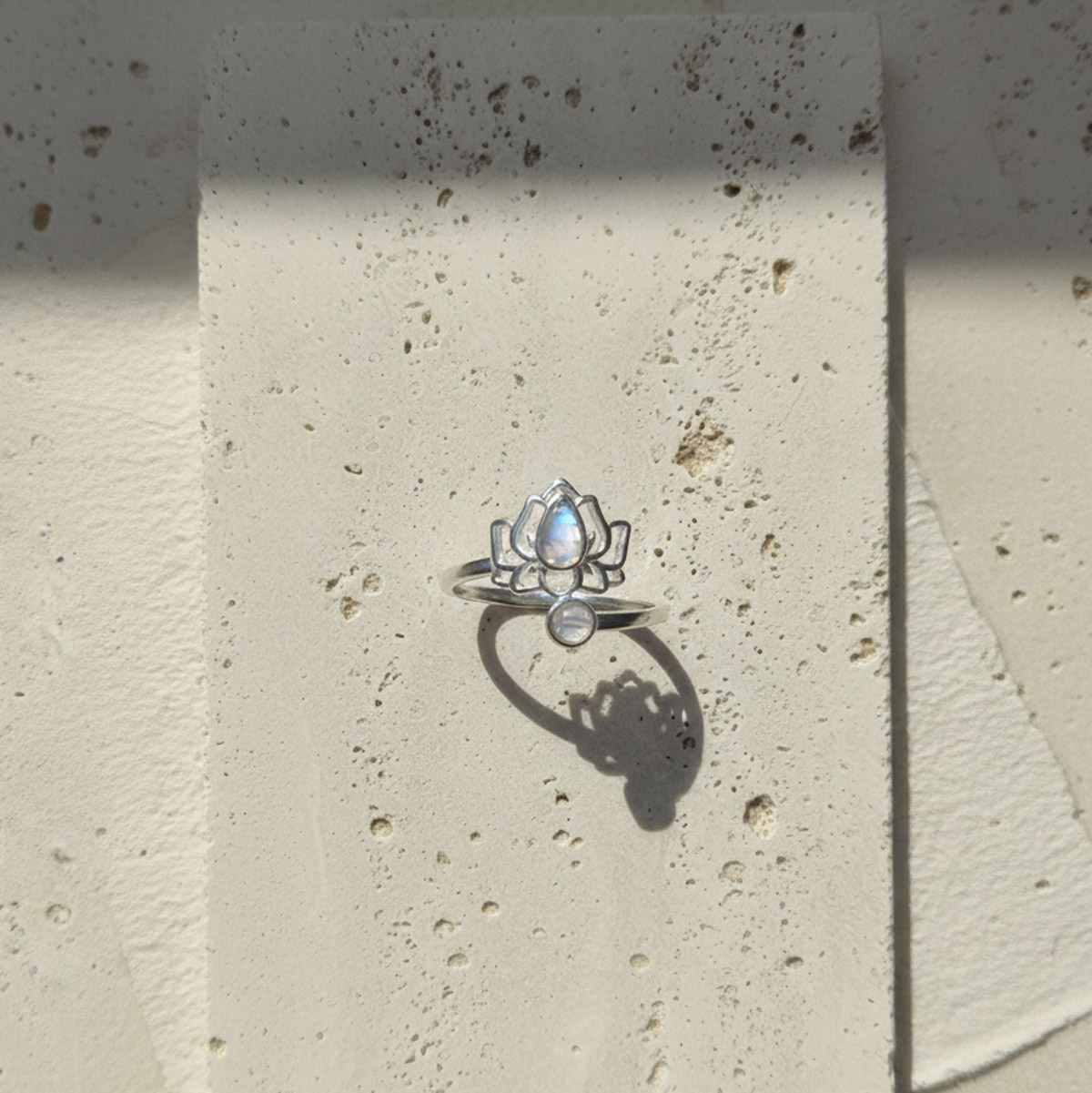 Anillo Flor de Loto en Plata 925 con Piedra Tornasolada – Ajustable