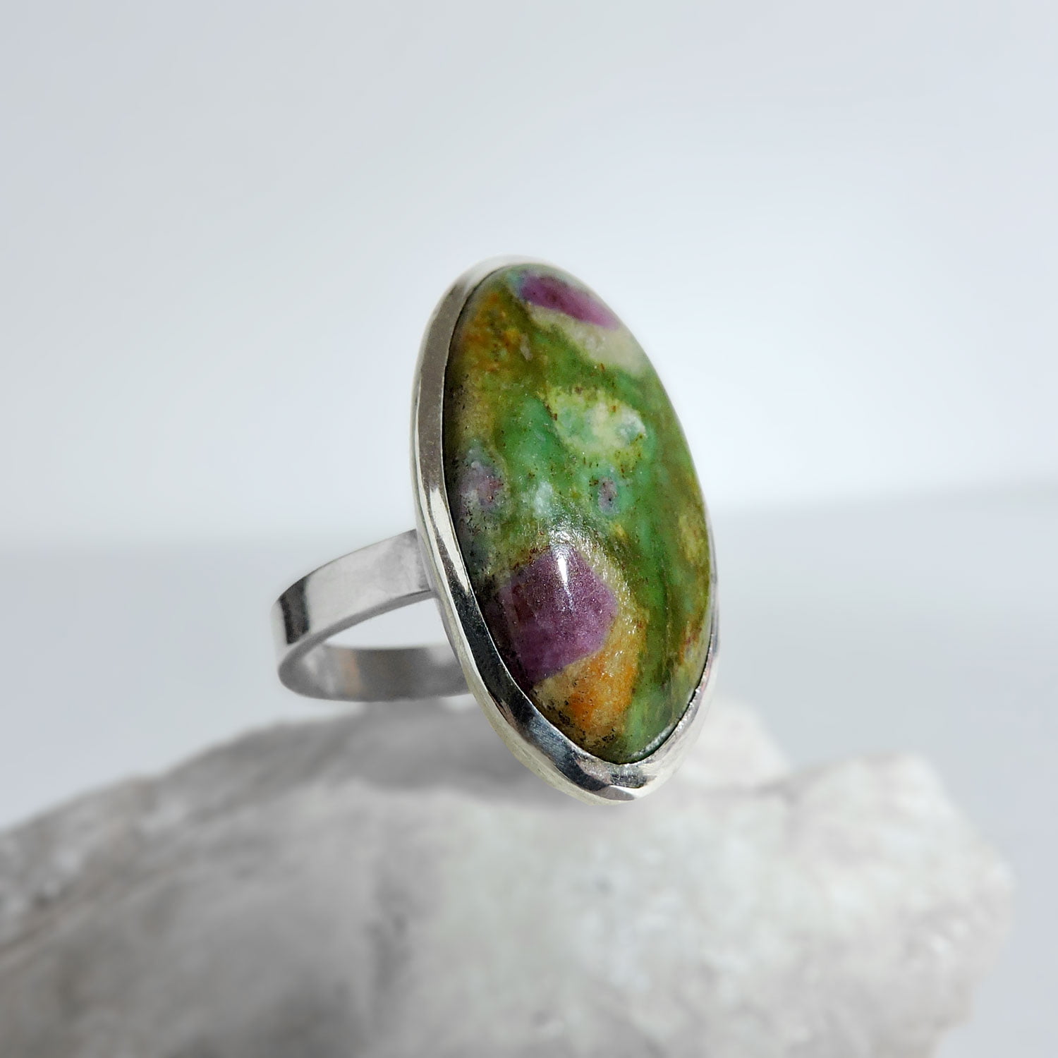 Anillo hecho a mano en Plata 950 con piedra Fucsita con Rubí.