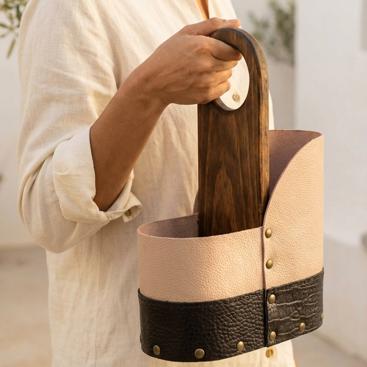 Textura: Tacto suave del cuero natural con base de madera pulida.