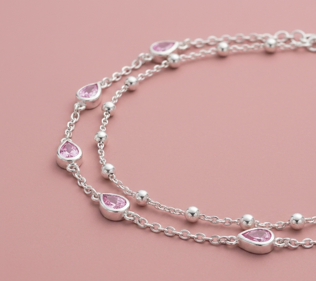 Esta pulsera destaca por su estructura de doble hilo, que ofrece el efecto visual de dos joyas superpuestas con la comodidad de un solo cierre. La combinación de las mini esferas pulidas con el destello suave de las circonias rosadas crea una armonía visual perfecta. Es una pieza pensada para quienes buscan un accesorio femenino y moderno que resalte la delicadeza de la muñeca con un toque de color sutil.